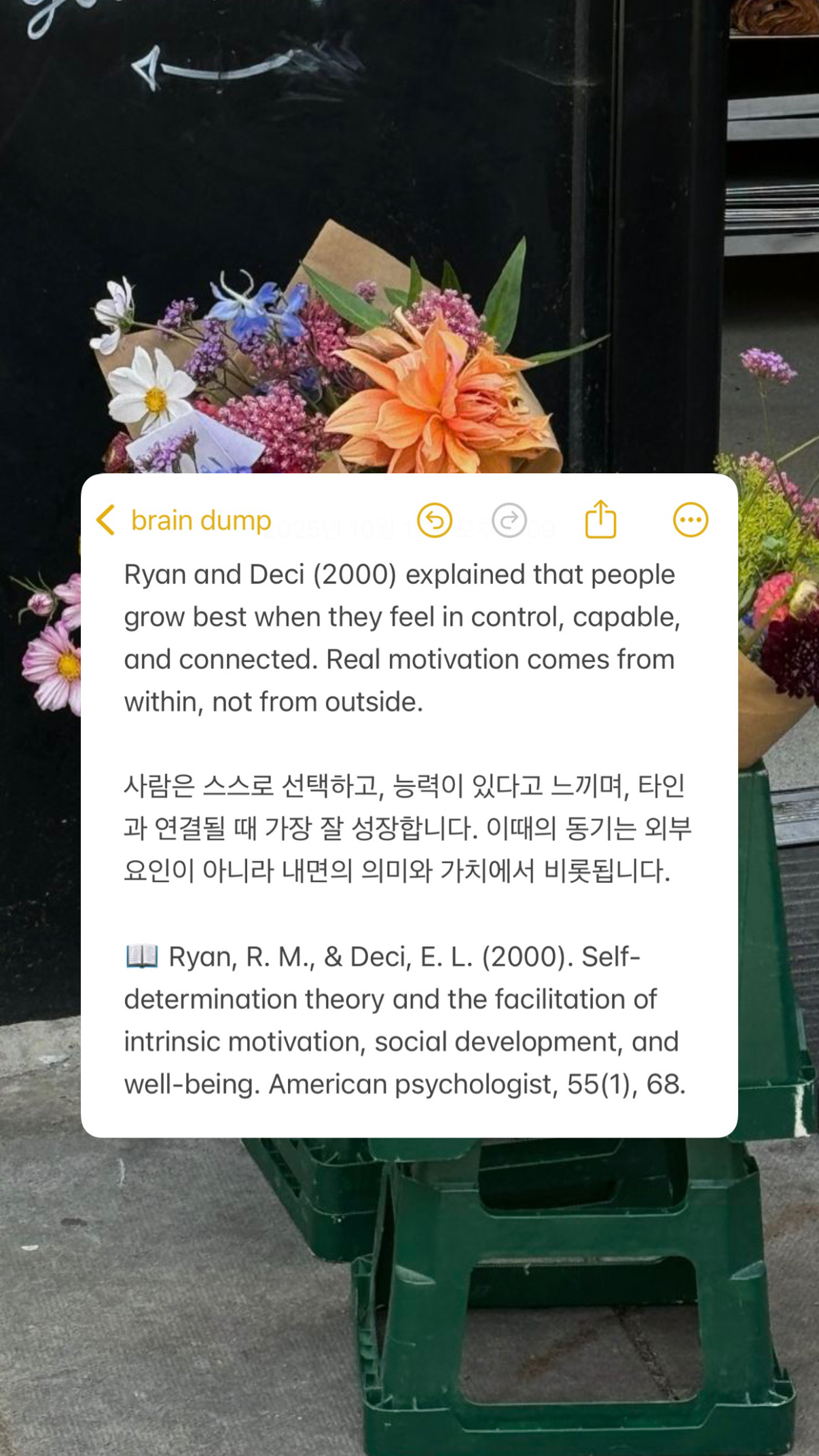 저는 항상 좀 느렸어요. 엄마 말로는 제가 걷는 것도 엄청 늦게 걸었대요! 밥도 엄청 느리게 먹고요. 제가 좋아하고 잘하는 게 무엇인지 찾는 건도 오래 걸린 것 같아요. 하지만 분명한 건 하나하나 제가 다 직접 경험하면서 파악하고 깊게 들여다 보는 건 자신있더라고요. 엉덩이가 무거워요. 제가 관심사라고 생각한 것들을 공부하고 그걸 제 삶에 연결하고 주변 사람들이랑 공유하는 걸 좋아해요. 그리고 저는 그런 제 성향 그대로 수업 커리큘럼도 만들어가고 있어요.
